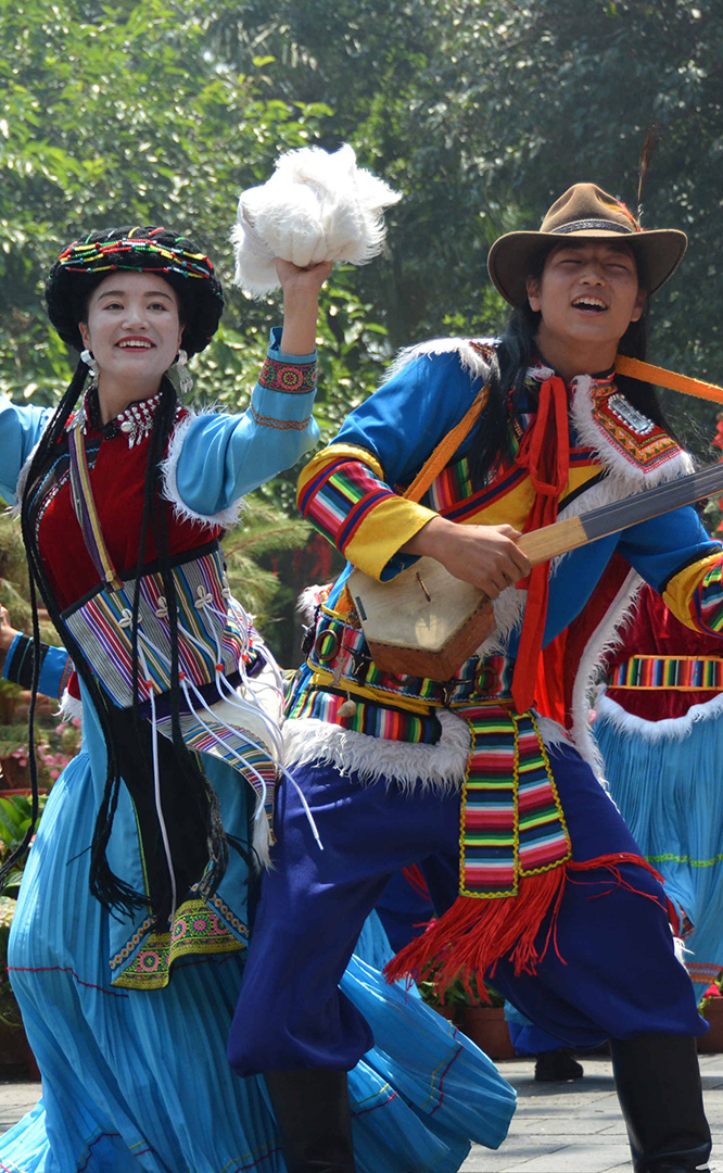 彝族在云南境內(nèi)約471萬人,是省內(nèi)人口最多、分布最廣的少數(shù)民族,主要聚居在金沙江、元江流域和哀牢山、無量山腹地。彝族是一個(gè)能歌善舞的民族,民間打歌、跳樂之風(fēng)盛行,大三弦、跌腳舞久負(fù)盛名。火把節(jié)是彝族最具特色的民族節(jié)日。彝族村占地50余畝,三虎浮雕墻與虎頭內(nèi)祖師形象表現(xiàn)了彝族虎鷹文化。太陽歷廣場(chǎng)圖騰柱上有太陽、虎、火和八卦圖形象,周圍環(huán)繞著10個(gè)朝向不同的月球造型,外圓周有12生肖石雕。依山而建的“...